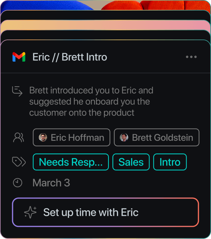 Everything - companies, people, and more - is enriched with hundreds of datapoints from a rich global and personal knowledge graph. Plus any property can be updated automatically when there's new email or meeting activity.